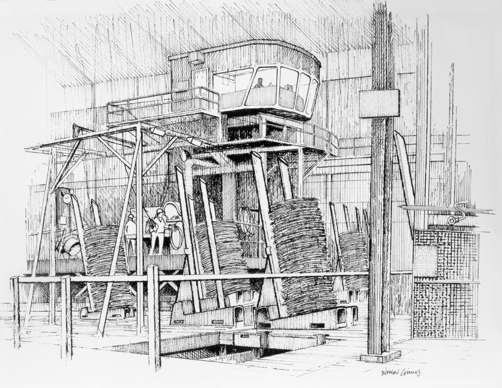 Print nifer cyfyngedig (rhif 1 o 20) yn dangos cludwyr oeri coiliau'r felin rodenni. Llofnodwyd gan yr artist.