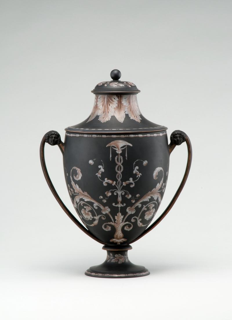 Oval medallion, blue jasper, applied with the head of Julius Caesar in white jasper, in profile to left, crowned with a wreath of laurel tied with ribbon at the back. Back of the medallion pierced with eight large and two small holes. Firing cracks to the relief, and three small edge chips repaired.