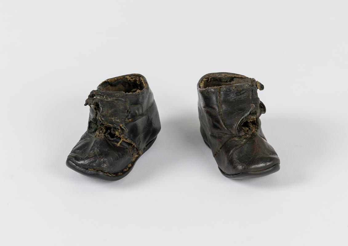 Pair of men's shoes, 1970s. Purchased in Saxone, Broadmead. Charcoal grey leather uppers with decorative stitching on vamp, very pointed toes. Laced fastening, four sets of eyelets. Stacked 5cm heel. Leather inners. Gold printing on inner sole mostly illegible. Size 42. Includes adjustable wooden shoe lasts.