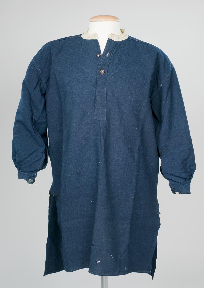 Mid-blue woollen knitted jacket hand-knitted from Bellmans pattern, about 1961-62. 'Chunky' yarn. Shawl collar knitted in single rib, knitted in one piece with front welts. Body and long sleeves knitted in moss stitch, with single rib welt. Five large decorative blue plastic buttons fastening at front with single press stud at welt, all seams hand sewn in matching wool. Hand-knitted by Judith Osborn for her husband, John Osborn.