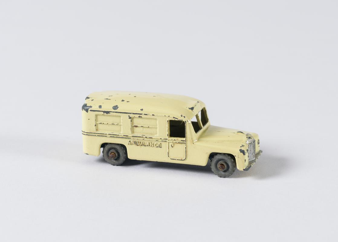 Die-cast Lesney van, painted blue, with tin-plate baseplate and running on metal hubs fitted with detachable rubber tyres.