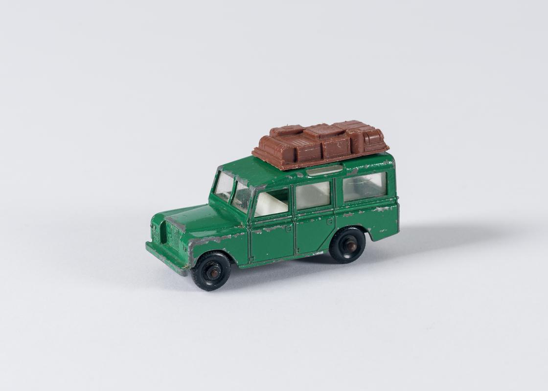 Die-cast Lesney van, painted blue, with tin-plate baseplate and running on metal hubs fitted with detachable rubber tyres.