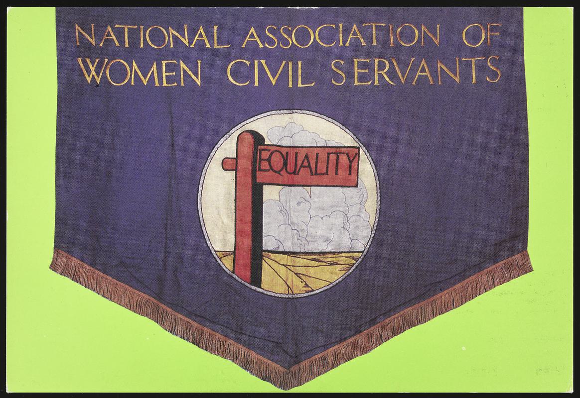 Postcard featuring a colour photograph of a suffrage banner used by the National Association of Women Civil Servants. The banner is in the collection of the LSE Library. Reproduced as a postcard by Ian and Thalia Campbell/Women for Life on Earth. Printed by Gomer press, Llandysul. From the collection of Thalia Campbell – a founder member of the Women for Life on Earth group who established the peace camp at Greenham Common in September 1981.