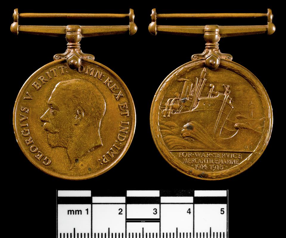 Medal Ryfel y Llynges Fasnachol 1914-1918, cyflwynwyd i William George James o'r Llynges Fasnachol. Arysgrif ar yr ymyl. Rhuban coch, gwyn a gwyrdd. Mewn amlen bapur.