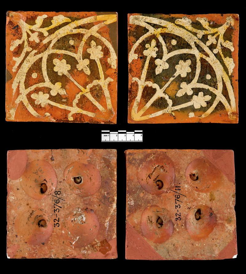 Inlaid. 4-tile pattern: three-branched foliage within traceried circle; stiff-leaved foliage in spandrel (pl.5A). BM Design 2767; Glastonbury Abey (no.48).