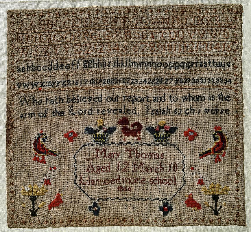 Unbleached linen canvas embroidered in coloured silks with alphabet, numerals and maker's name. Dated November 1791.