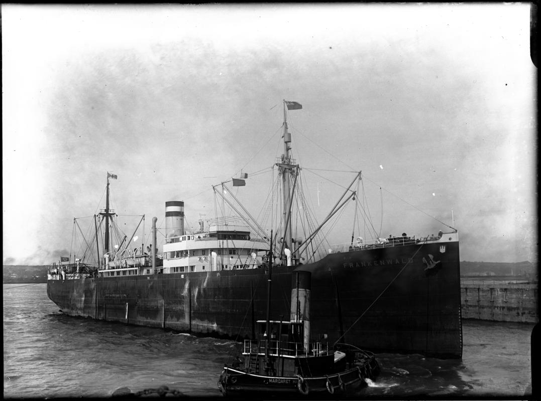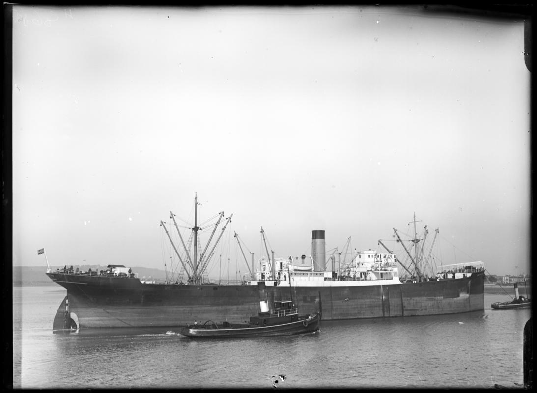 Starboard broadside view of S.S. EVERANNA and tug WARDLEYS, c.1936.