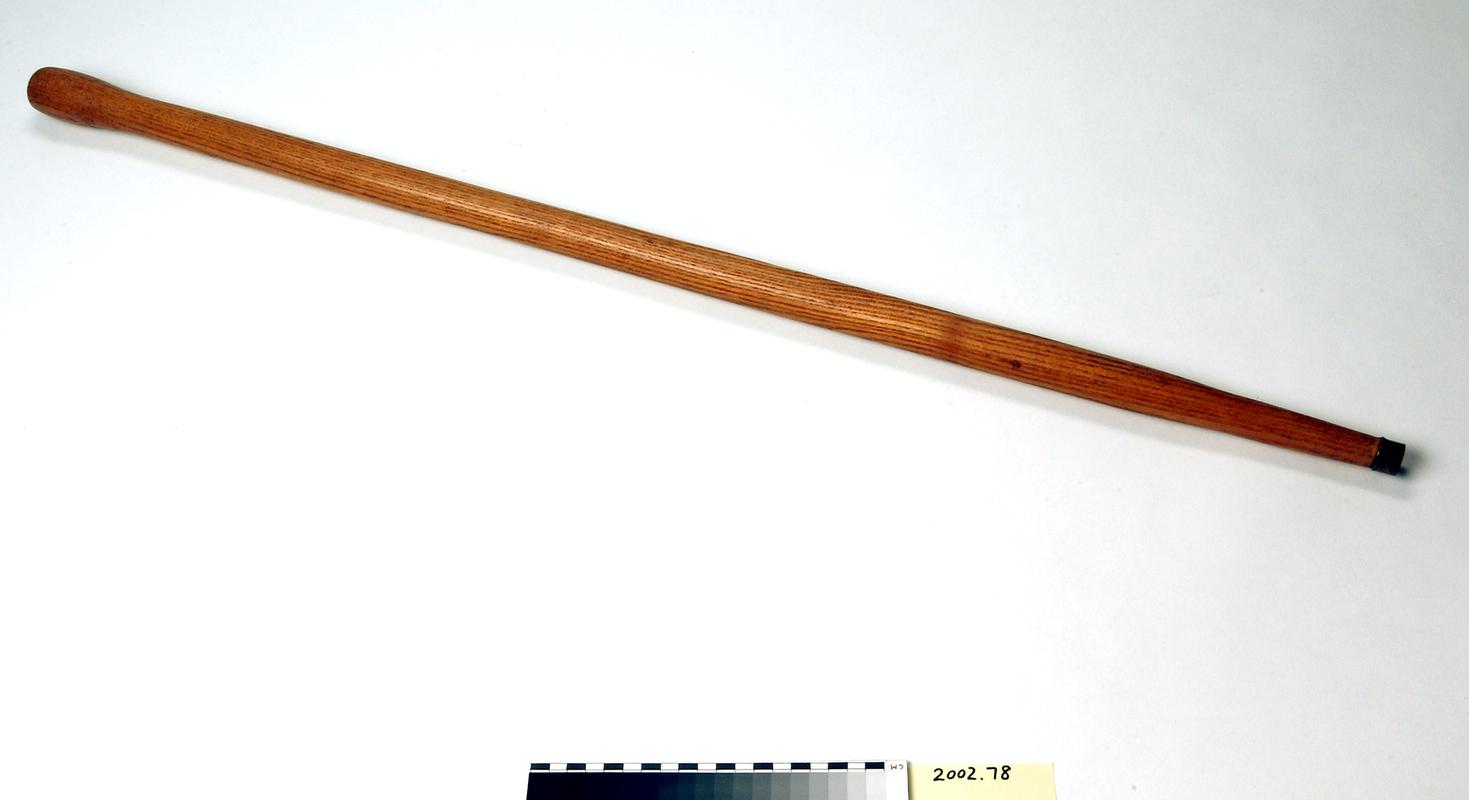 Carved colliery official's yardstick given to William Lewis on his retirement in 1881. The yardstick has been adapted as a walking stick. About 6" has been cut off one end (removing the knob with hole to raise the lamp) and a curved length of wood attached to form a new handle.