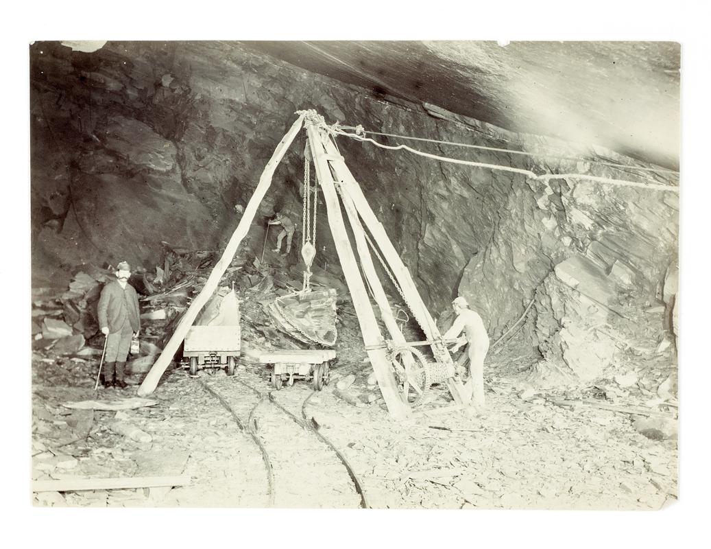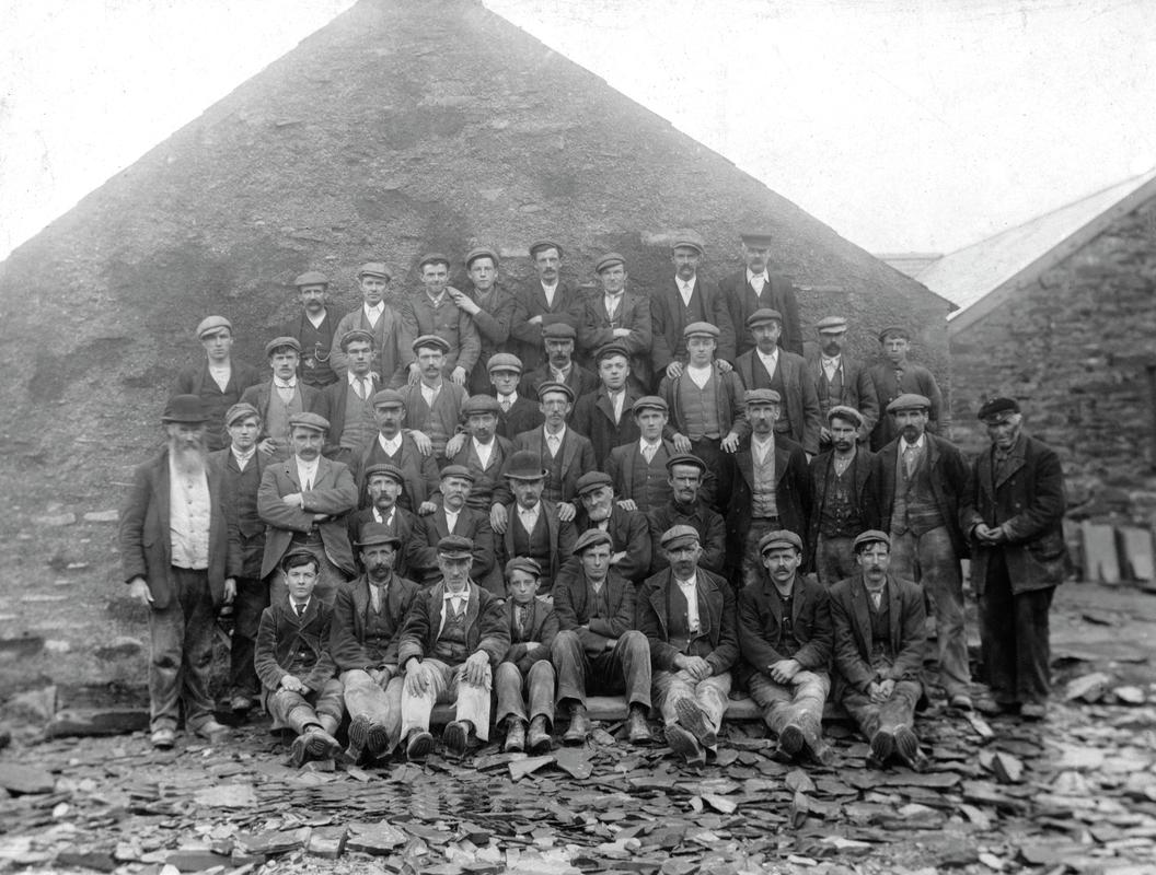 Photograph showing a group of Dinorwig Quarry workmen at Hafon Owen. Mounted on card mount.