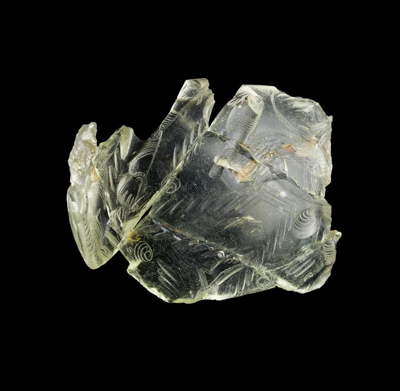 Body fragment of prismatic bottle of blue-green glass. Some flaking iridescence.
