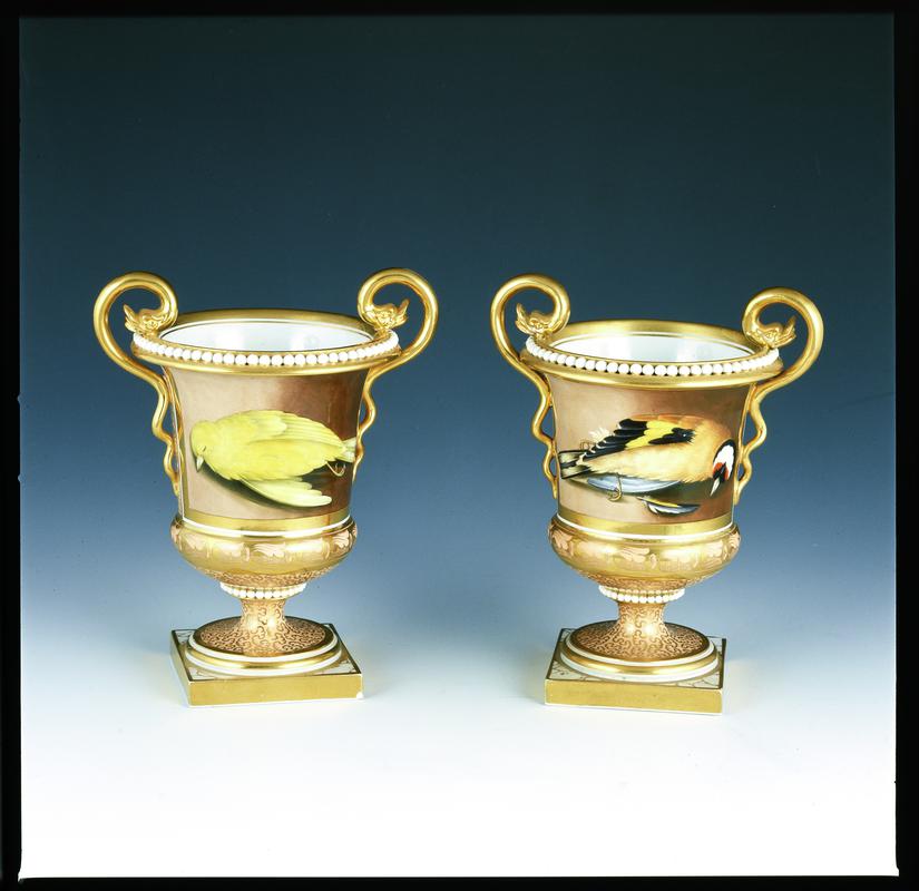 Plate, soft-paste porcelain, circular; enamelled in the well with a dead bullfinch and a dead goldfinch on a marble table, plain gilded bands either side of a gilded border of scrolling palmettes.