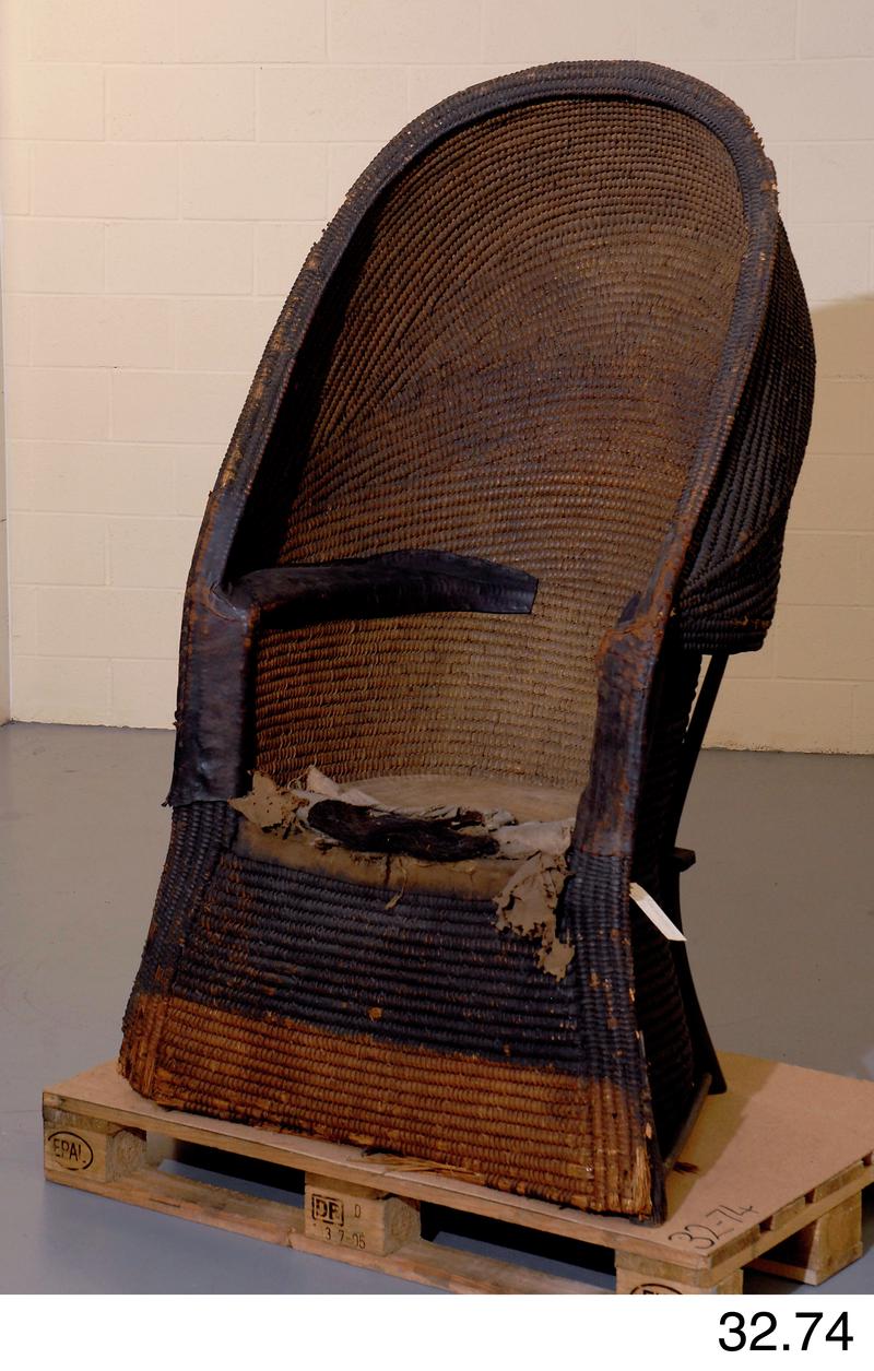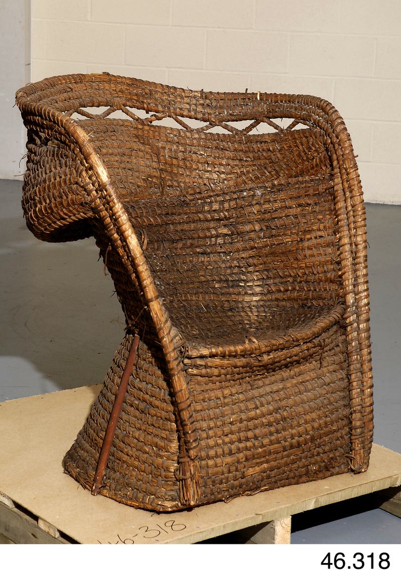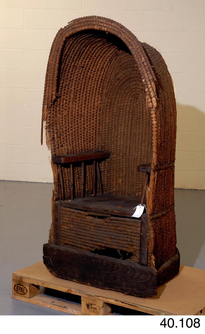 A lipwork chair known variously as 'harpist's' or 'porter's' chair; it has a canopy of woven straw held together by bramble thongs, re-inforced joints and curved portion beneath seat, which is of wood.