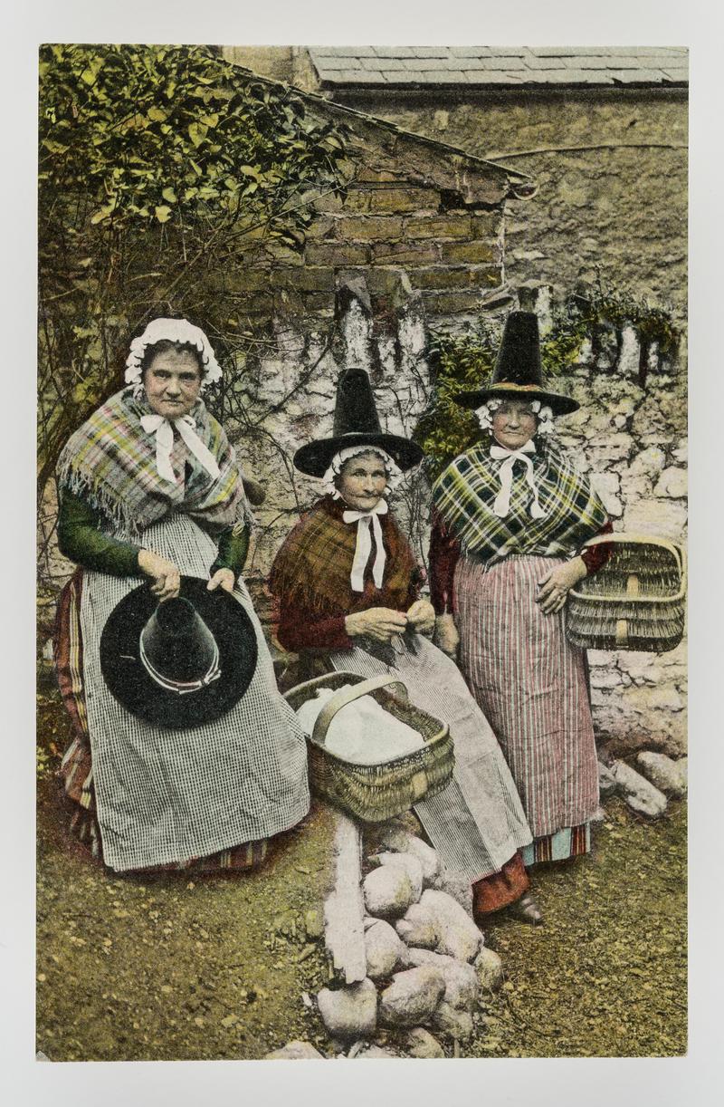 Print from an original published in volume 'Cambrian Costumes', Lady Llanover c.1934. No. 13 'Cymraes ieuanc mewn Dull-wisgiad Ceredigion. Welsh Girl in the Costume of Cardiganshire'.