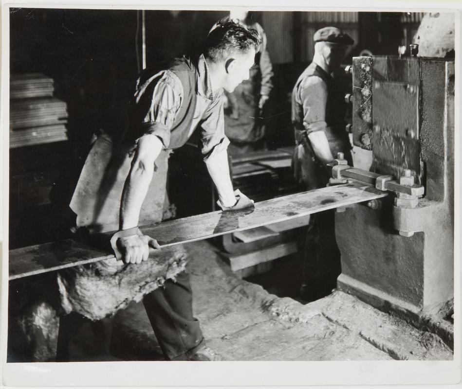 Furnaceman charging part rolled sheets into a mill furnace, Eaglesbush tinplate works, Neath.
