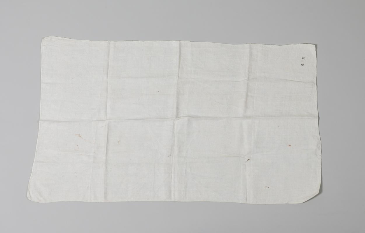 Sheet. Part of a laying out set, including six sheets and one pillowcase. All are marked with initials ‘AW’ – Ann Watkins of Glaisfer Farm, Llangyndir, who made the set.