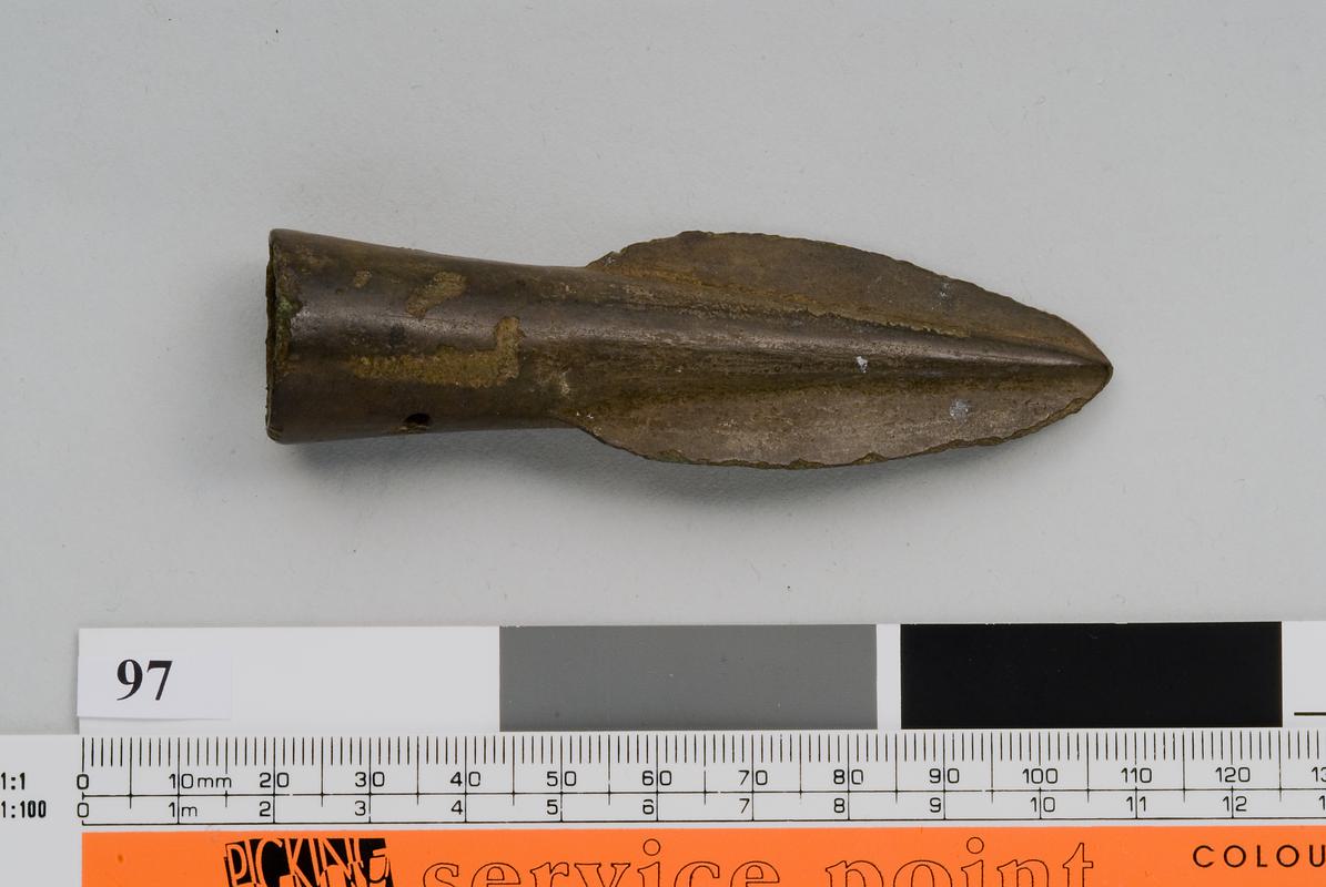 Plain pegged spearhead fragment. Partial upper-socket and lower blade fragment of socketed spearhead. The angle of separation of the blade base from the socket is steep. The width of 11.9mm from socket side to blade edge only 18mm up the blade indicates a wide blade base of kite shaped form. The circular socket continues up the middle of the blade, however tapers to 16.0mm diameter by the upper break. The casting seams have been well ground down, although no filing marks are visible. Most of the original blade edges have been chipped or corroded, however at one point, grinding marks at an angle to the blade edge indicate the blade was sharpened for use. Both upper and lower break edges look angular and fresh, although are soil covered. There is no denting, tearing or distortion to suggest impact or force exerted in breakage.