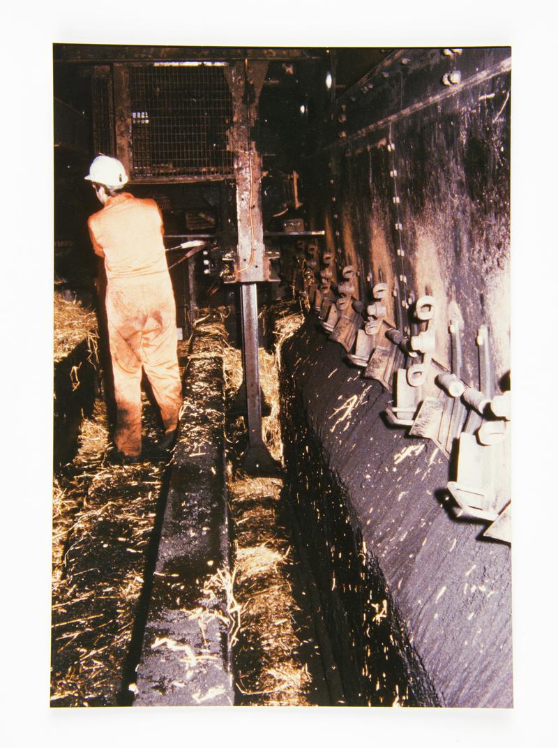 View at Coedely Coke Ovens showing man cleaning up coal from a broken charge, 1983.