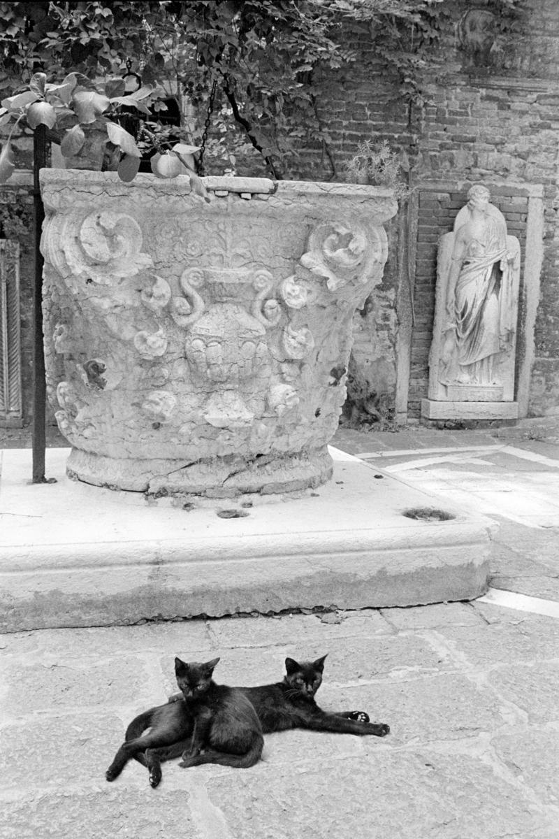Hand delivery of funeral flowers, youths crossing one of the many bridges in Venice. Italy