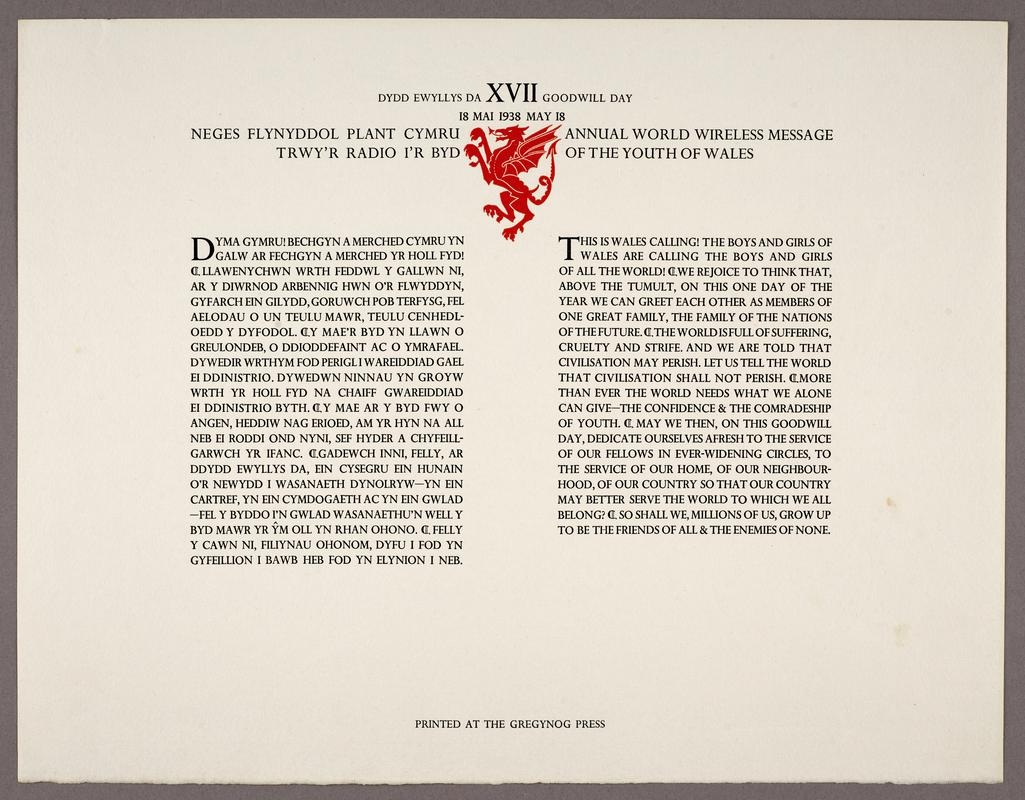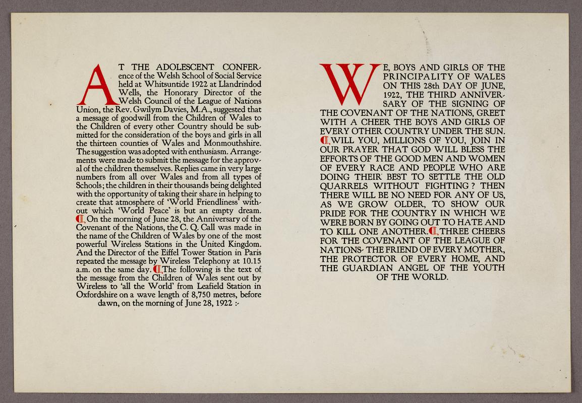 Cês dillad Annie Jane Hughes-Griffiths, gyda llythrennau cyntaf ei henw i’w gweld arno. Cafodd ei ddefnyddio ganddi pan arweiniodd dirprwyaeth o Gymru i gyflwyno Deiseb Heddwch Menywod Cymru i’r Unol Daleithiau ym 1924. Roedd 390,296 o fenywod Cymru wedi llofnodi’r ddeiseb heddwch a’i chyflwyno i fenywod Unol Daleithiau America. Roedden nhw’n galw am ddyfodol heb ryfel.