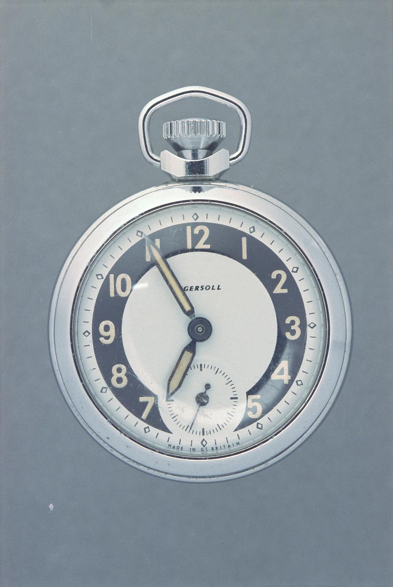 Pocket watch used by donor's father Sidney George Gardiner at Markham Colliery, and later given to donor. On silver chain with three seal fobs (seal fobs were added later) and in watch case (turnip).