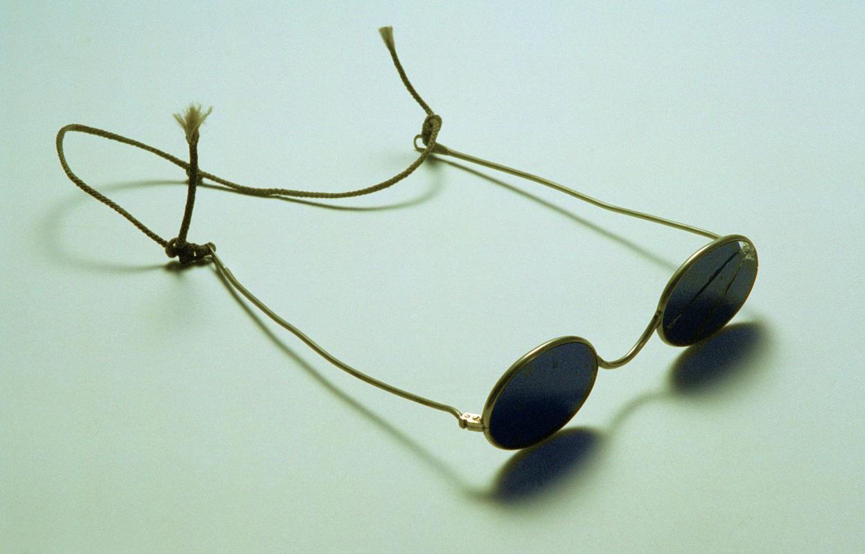 Steelworker's blue spectacles with string attached to frame. String has also been wound round nose piece (this was to protect the face as the metal frame could get very hot). Used by furnace men to look into open hearth furnace at Pontardawe. With home made protective case (2011.65/15).