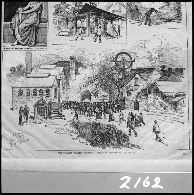 Black and white film negative showing the scene at Universal Colliery Senghenydd after the explosion of May 24th 1901, photographed from a publication. 'Senghenydd 1st disaster 1901' is transcribed from original negative bag.