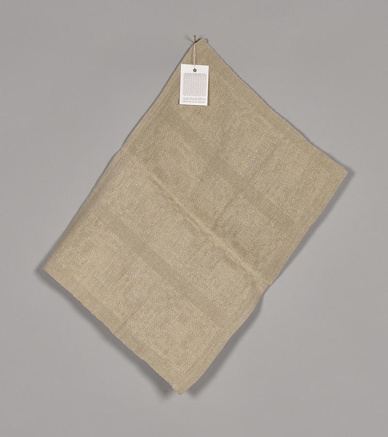 Table runner handwoven by Alison Morton in unbleachedl linen, plain weave. Central black band in weft with ribbed weave of white stripes and an orange stripe either end. Thin black stripe in central warp.Alison Morton printed card label attached with safety pin and details on reverse written in pencil, priced £160.