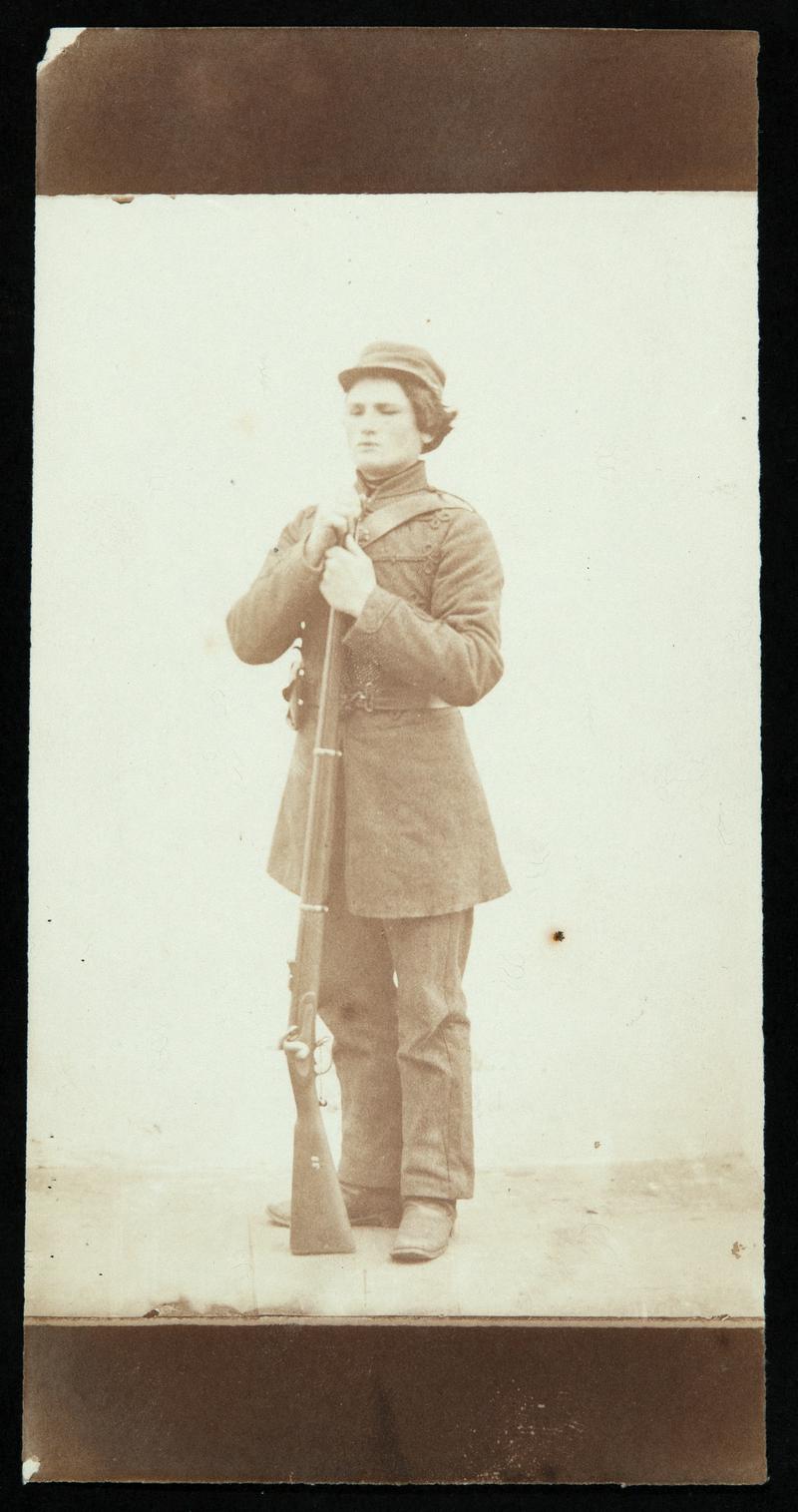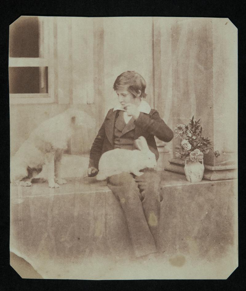 Mounted salted paper print, cut to an oval photograph on mount. Thereza Llewelyn seated on rocks.