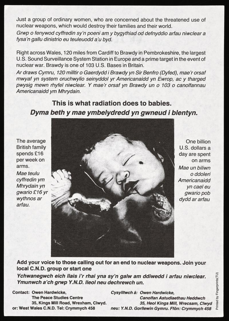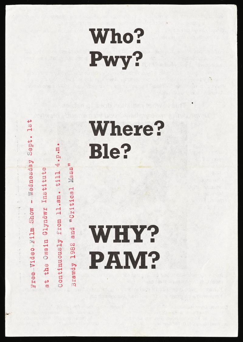 Double sided bilingual flyer 'Who? Pwy? Where? Ble? Why? Pam?'. Flyer states 'Just a group of ordinary women, who are concerned about the threatened use of nuclear weapons, which would destroy their families and their world.' From the collection of Thalia Campbell – a member of the Women for Life on Earth group who established the peace camp at Greenham Common in September 1981.