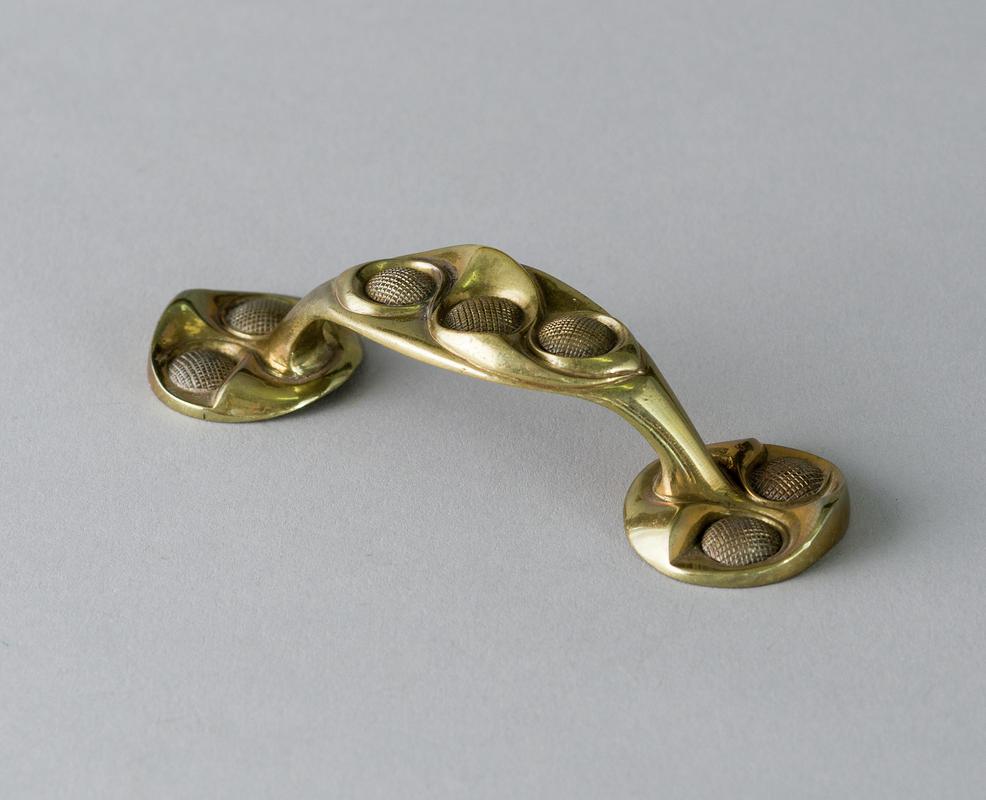 Drop-handle with angular cross-section and a fragment of each of the split pins still in situ. The surface is heavily eroded.