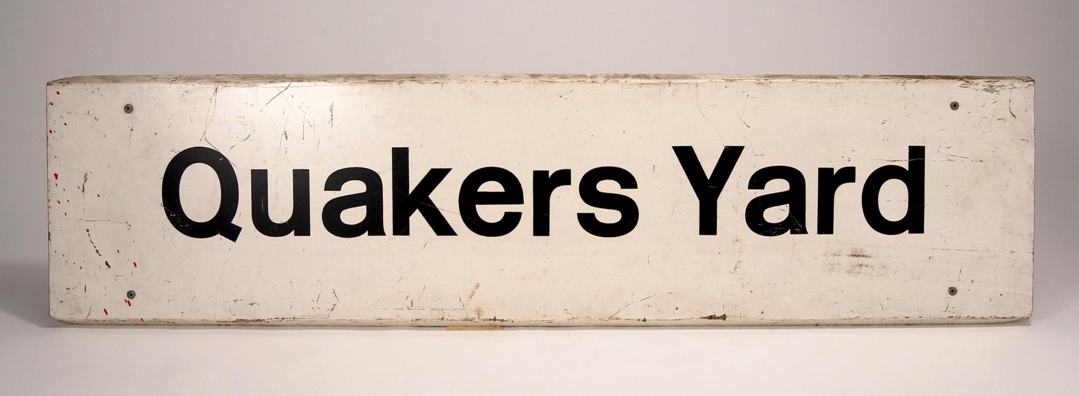 Reproduction of a Cambrian Railway Company pedestrian crossing sign June 1864. Wooden sign, nine line text, white letters on green ground within white frame.