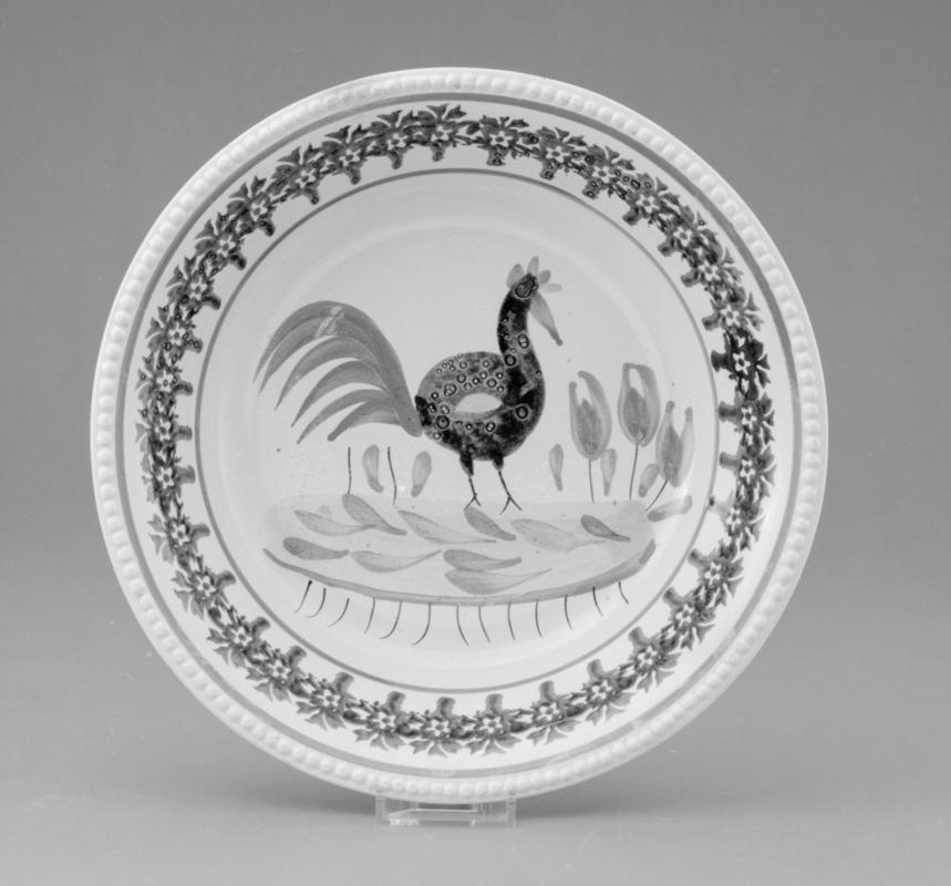 Plate, earthenware, circular shape, tapering foot-rim slanting inwards with an incised ring around it, curving sides and spreading rim, a slightly raised edge to the well; crudely painted in red-orange, blue, pink, green, yellow and brown with to the centre of the well an exotic bird perched on a plinth with a small fence behind and spreading sprays of flowers to either side, an orange band to the rim, a brown band to the edge of the rim.