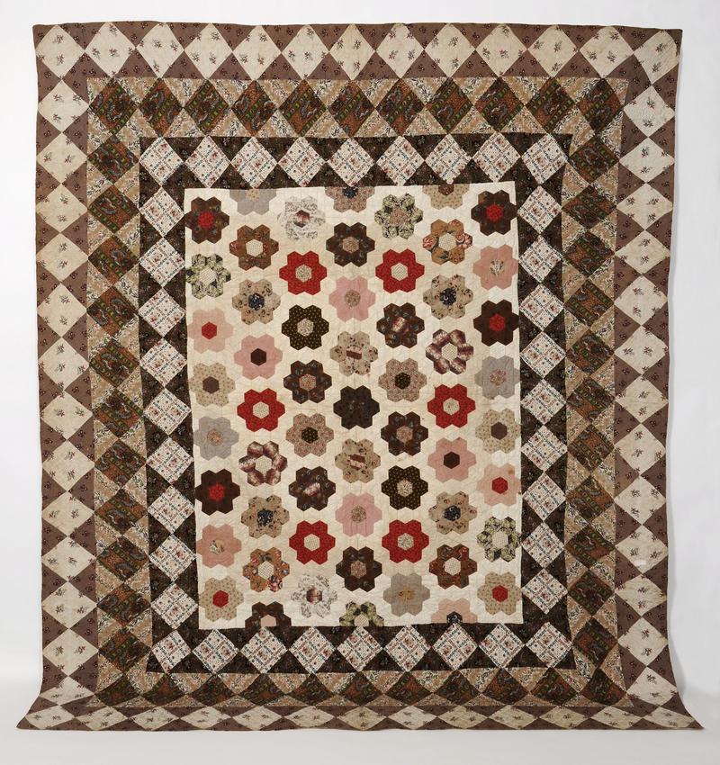haxagonal patchwork pincushion; made from felt patches; decorated with coloured beads; 6 black floral motifs; trimmed with fringe of beaded loops around the edge.
