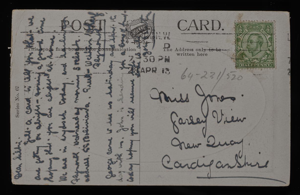 Sepia postcard of "Miss Perks Soldier's Home, Bulford Camp". Sent to Mr T.M. Jones of Bodwrog, from his cousin. Postmarked 05 March 1917.