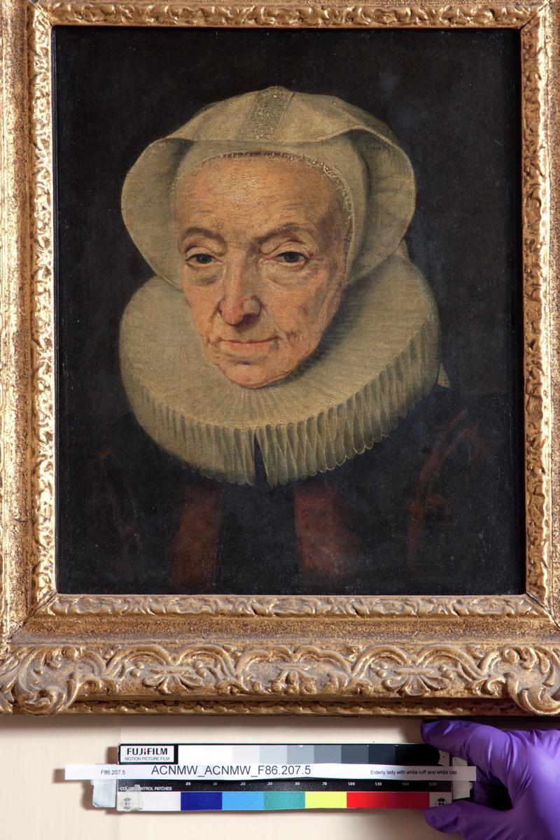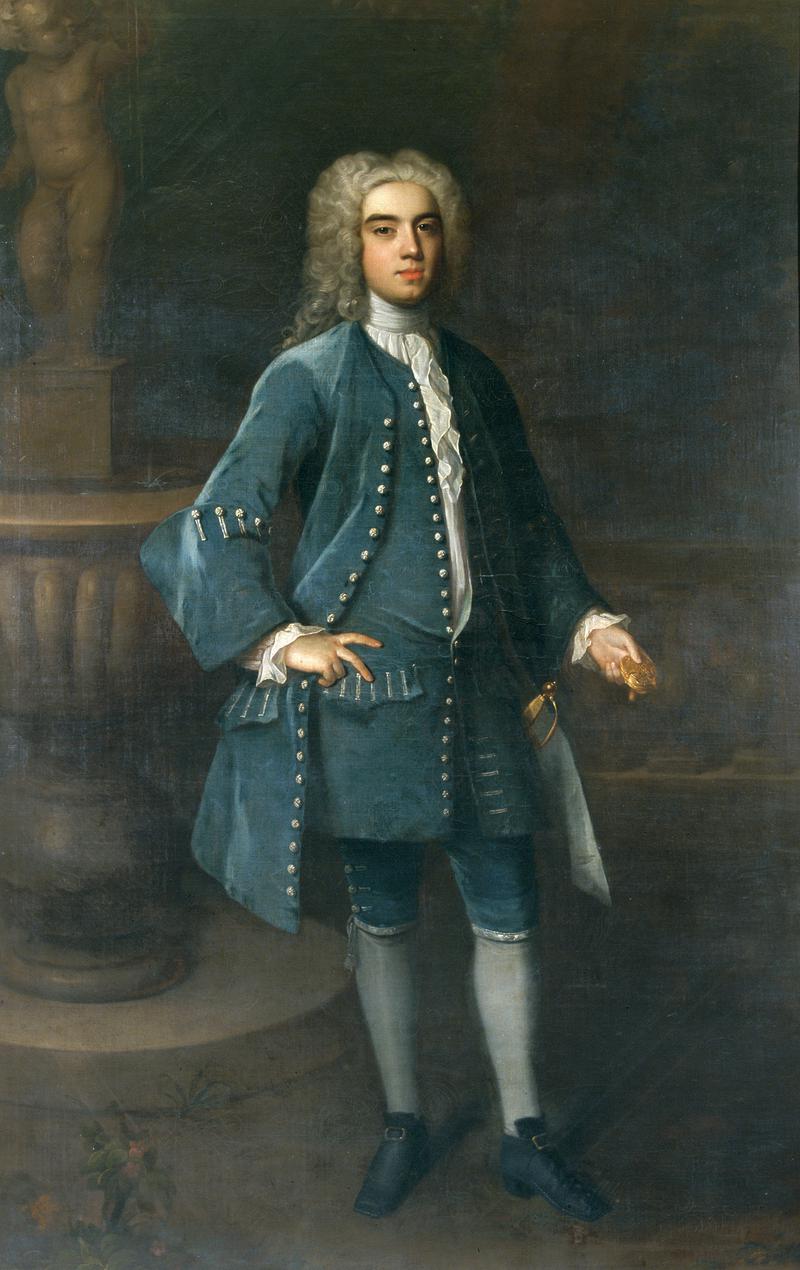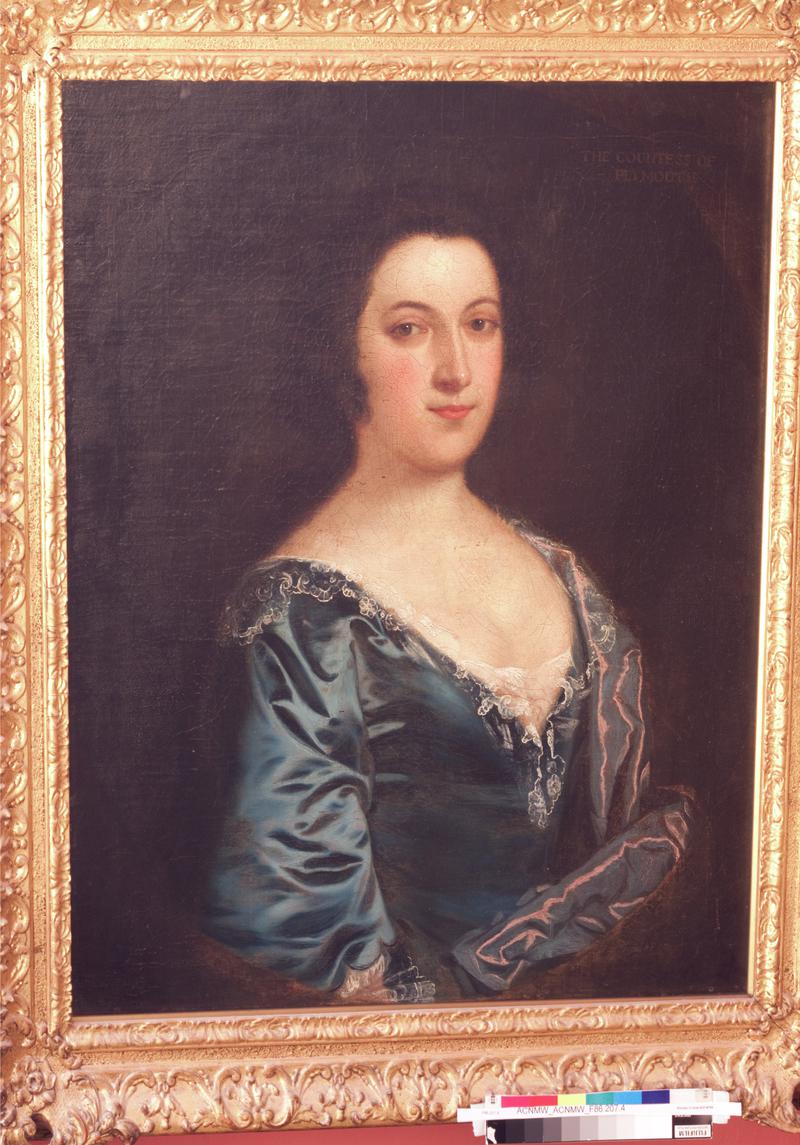 Capriccio of an imaginary formal garden and house attributed to Robert Robinson. In the centre is an avenue of pencil cedars and orange trees in boxes leading to a house. To either side are formal gardens and parterres. Sculptured fountain with swan in the foreground and men, women and dog. Gilt frame, label inscribed 'Tre-Worgen, nr Baglan, Monmouthshire, The Seat of Thomas Prichard Esq 1640-80'.
