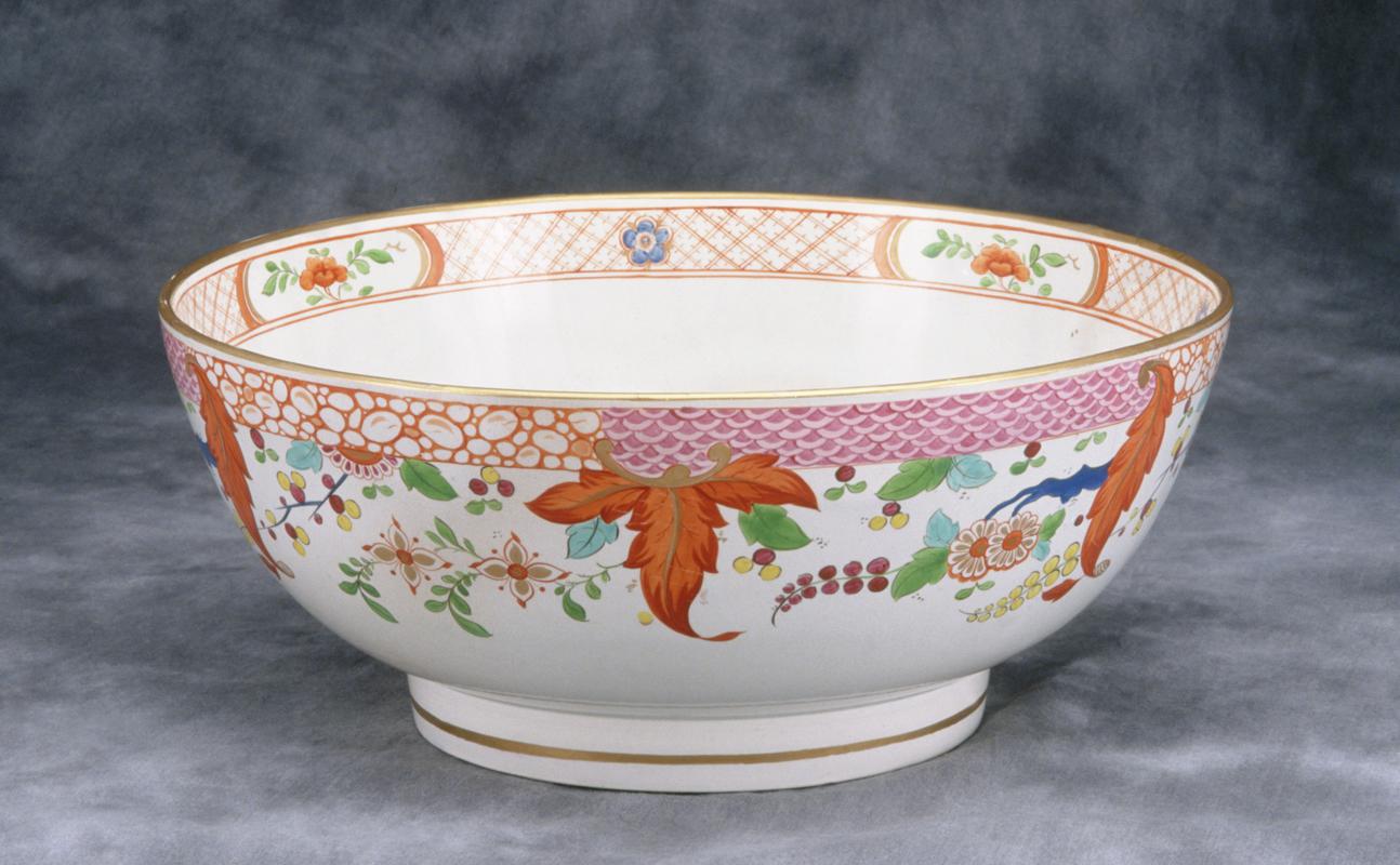 Pearlware bowl, circular, on foot ring. No ground colour; blue-tinged pearlware glaze. Centre painted in polychrome enamels with a least spotted woodpecker - black, red, yellow and white plumage - perched on a branch. Gilded band to rim.