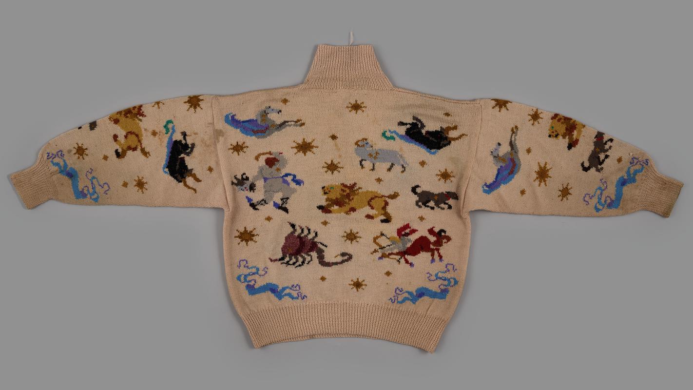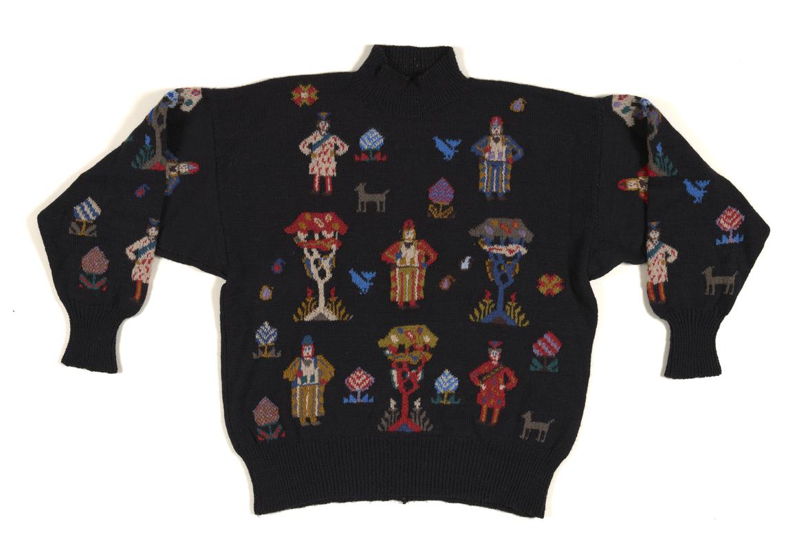 Sweater designed by Jamie & Jessi Seaton. Hand-knitted in cotton using the intarsia technique.