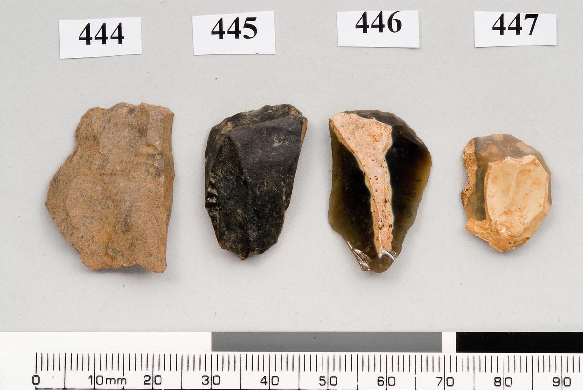 A large flint end-scraper made on a large flake on pale grey unpatinated flint. The scraping edge is at the endand the retouch is steep and radiates out from a central point. There are traces of cortex on the dorsal surface. The flake has been struck from a plain platform.