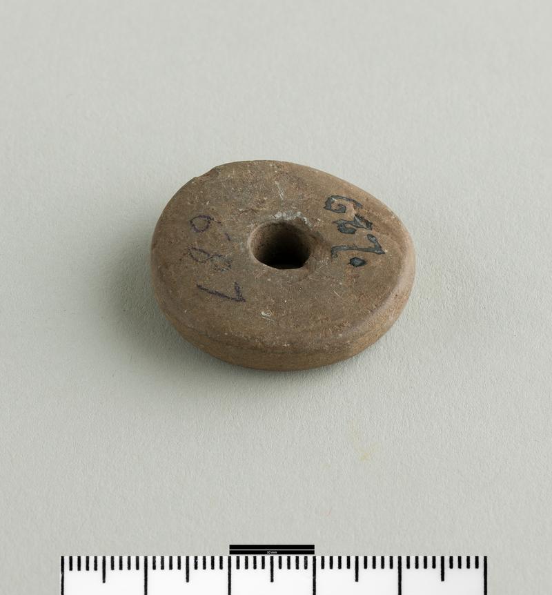 Chwerfan gwerthyd carreg o Gaer Dinorben, Conwy. 300 CC-400 OC. Parodd yr un dull o nyddu gwlân am filoedd o flynyddoedd.