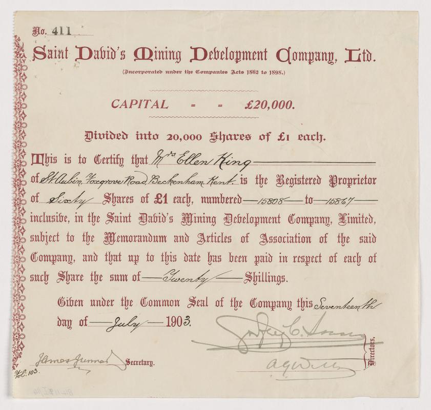 The Stepney Spare Motor Wheel Limited, £1 ordinary shares, 1907, black on white, vignette of an early automobile . * Black print on white paper with handwritten details completed in black ink. Large vignette of an early automobile stranded in a country lane with two men attempting to repair a puncture in heavy rain. Ornate border with wheels on left only. Embossed company seal on red circular sticker on lower left hand corner. 50 £1 shares numbered 72848 to 72897. Certificate number '612'. Dated 12 August 1907.