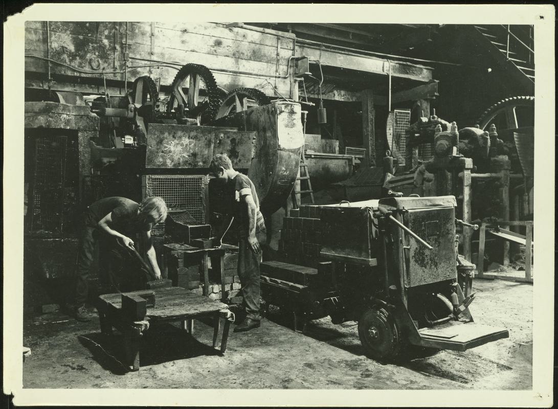 Hoffman continuous kiln at Tredegar brickworks. On the lift truck is Trevor. Setters are ? and Philip Price.