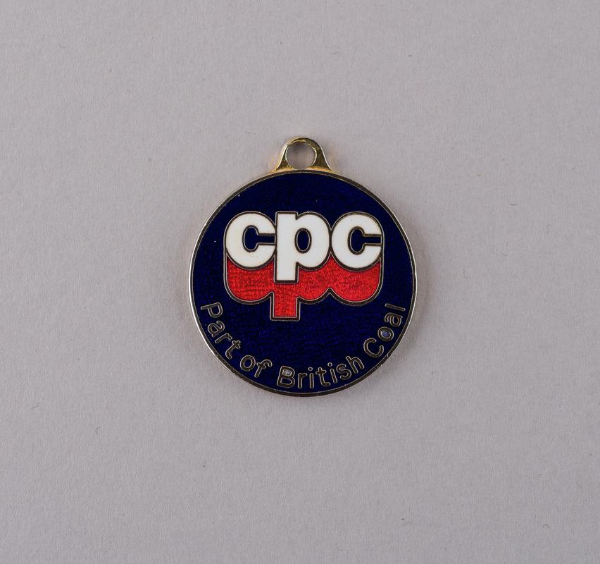 Circular metal badge with black inscription on yellow and red background. Pin on reverse.