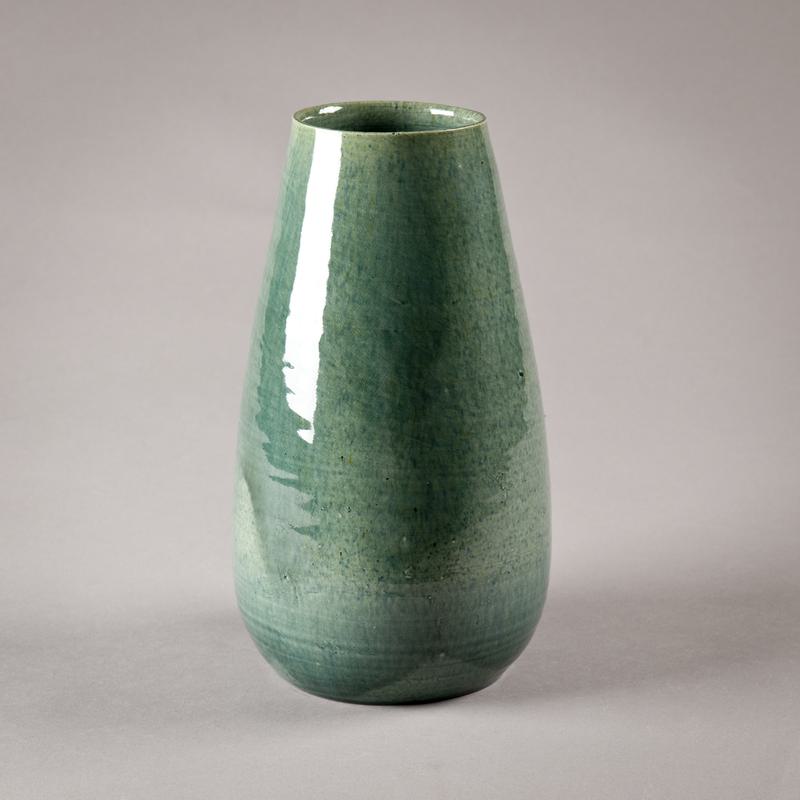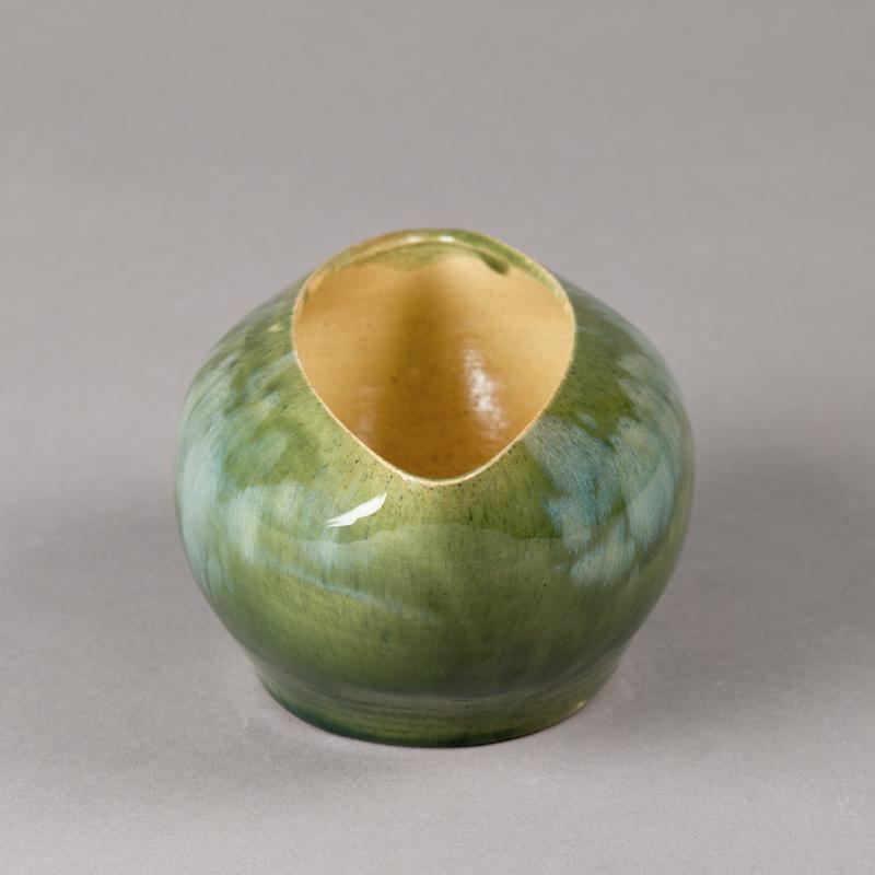 One of pair with F78.289.2; simple globular shape with streaky green glaze over white slip outside, brown glaze inside; sgraffito inscription.