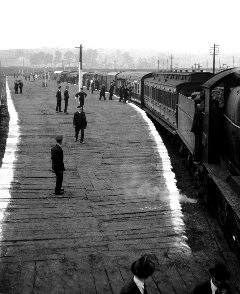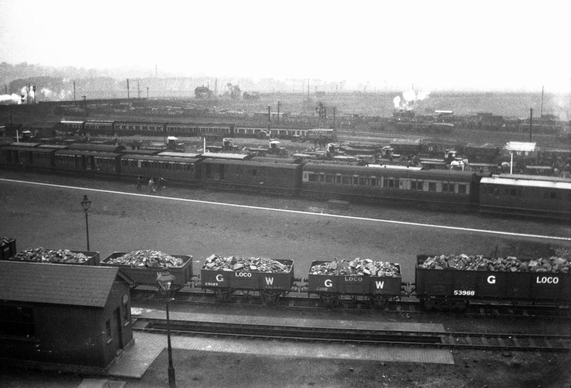 Looking north from Maesglas Road overbridge at Ebbw Junction, Newport. From left to right: Ebbw Junction engine shed coal stage and water tank with engine shed in distance behind, special station platform built for the Royal Welsh Show at Ebbw Bridge, Newport, July 1927 with prominent white edging, Western Loop (partly obscured by locomotive smoke) connecting to Ebbw Valley lines, Ebbw Junction Signal Box, south Wales main line immediately right of signal box, West Sidings, and at right side of photo part of Field Sidings. In the distance spanning all the lines is the former Newport (Alexandra) Dock & Railway Co’s overbridge that carried traffic from the Ebbw Valleys via Park Junction (to the left/west), across the south Wales main line, to Mendalgief Sidings and Newport Docks (to the right/east).