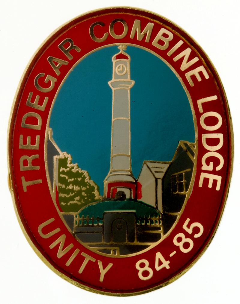 Metal pin badge in the shape of a miners lamp. Inscription set in black enamel.