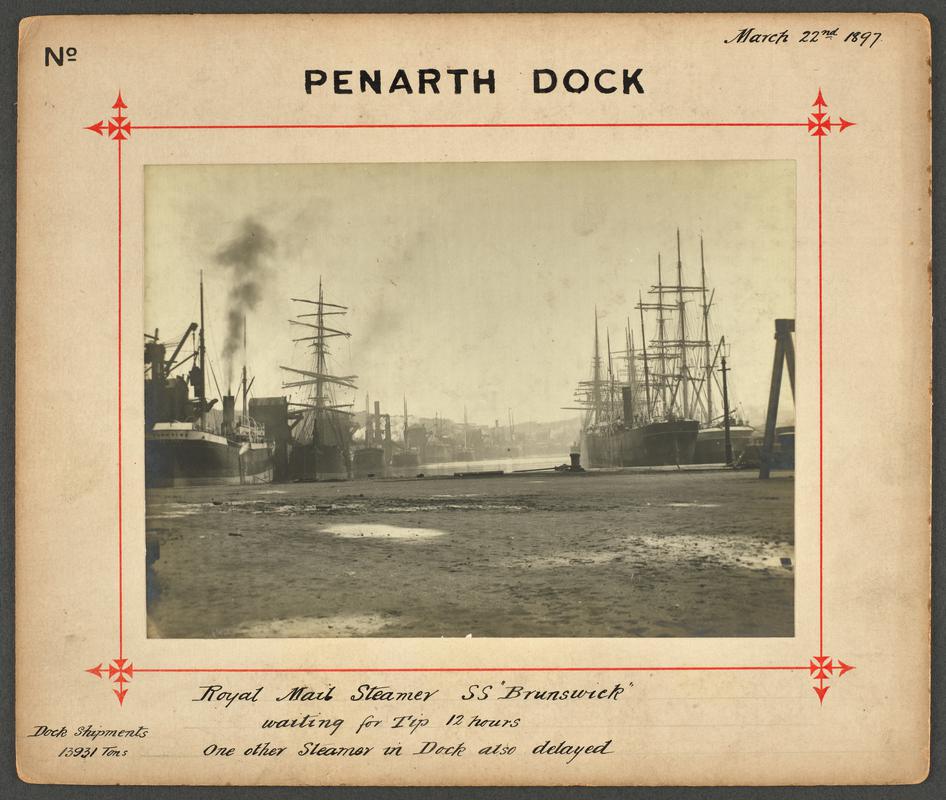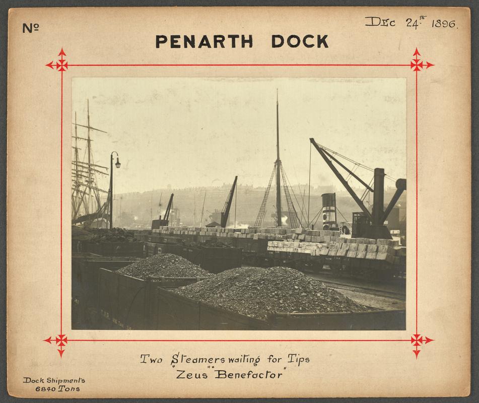 View of two sailing ships and coal wagons at Penarth Dock. Mounted on cream card with red decorative border.