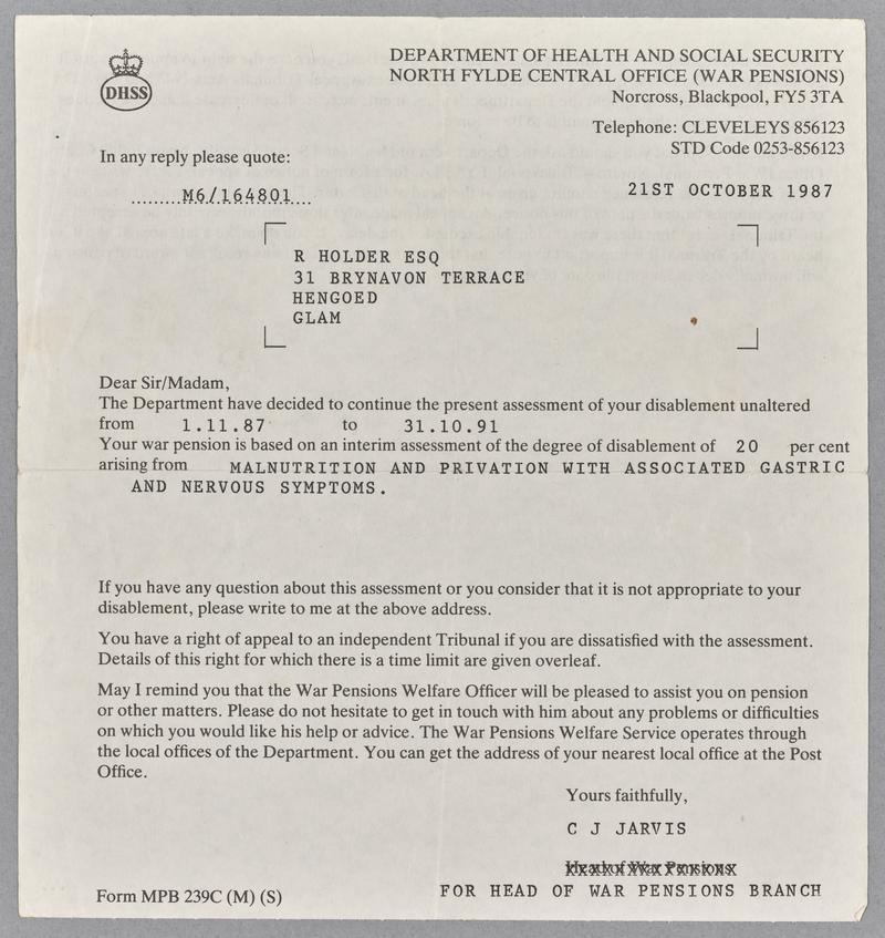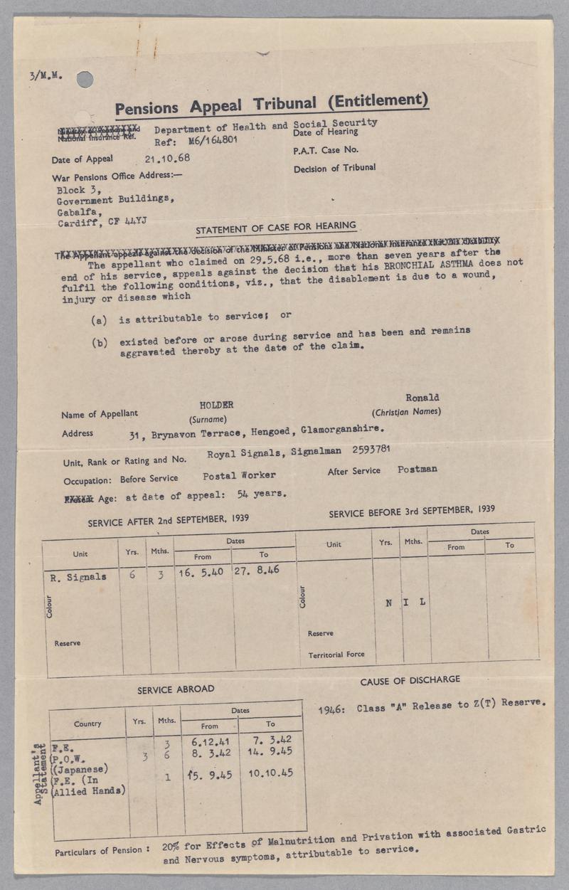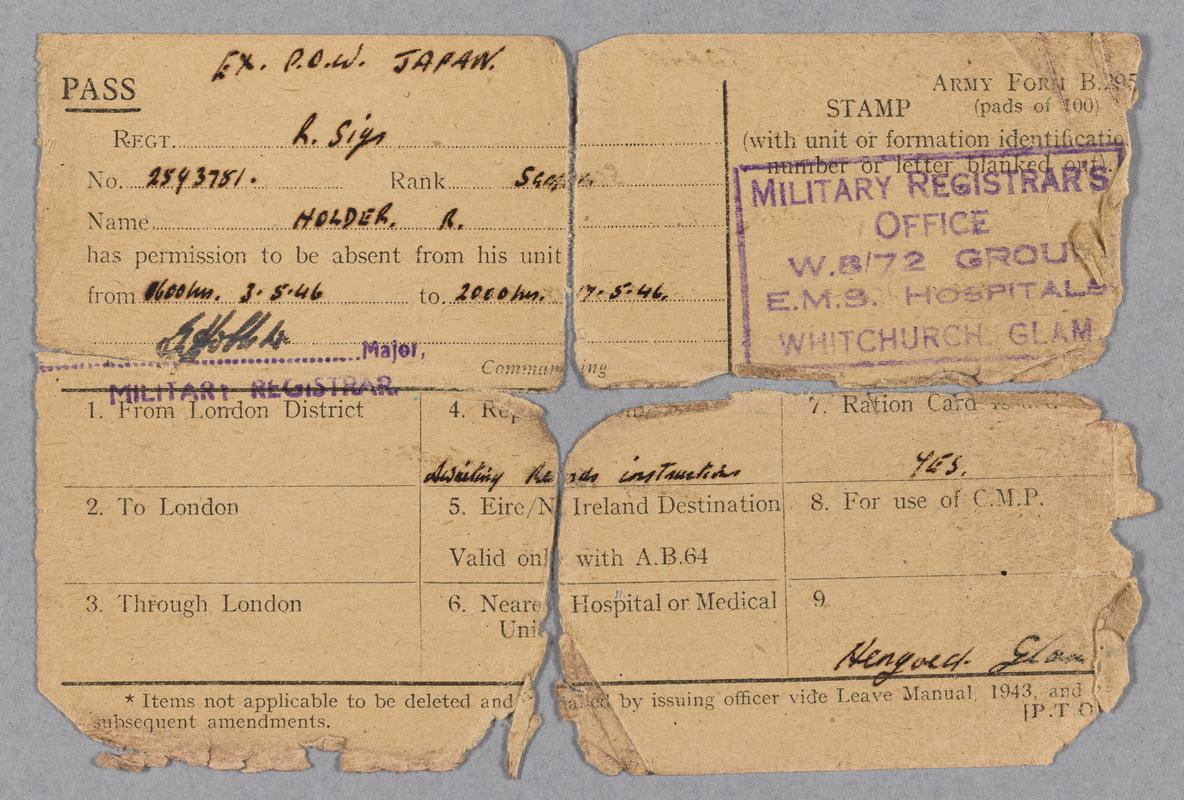 Part of a collection of items belonging to Ronald Holder. Ronald Holder was born in Abercynon in 1914. During the Second World War he joined the Royal Signals. Early in the war he was captured in Java, and spent three and a half years as a Prisoner of War in the hands of the Japanese. He was liberated by the Gurkha’s and eventually came back to Wales via the troop ship M.V. Teglelberg.