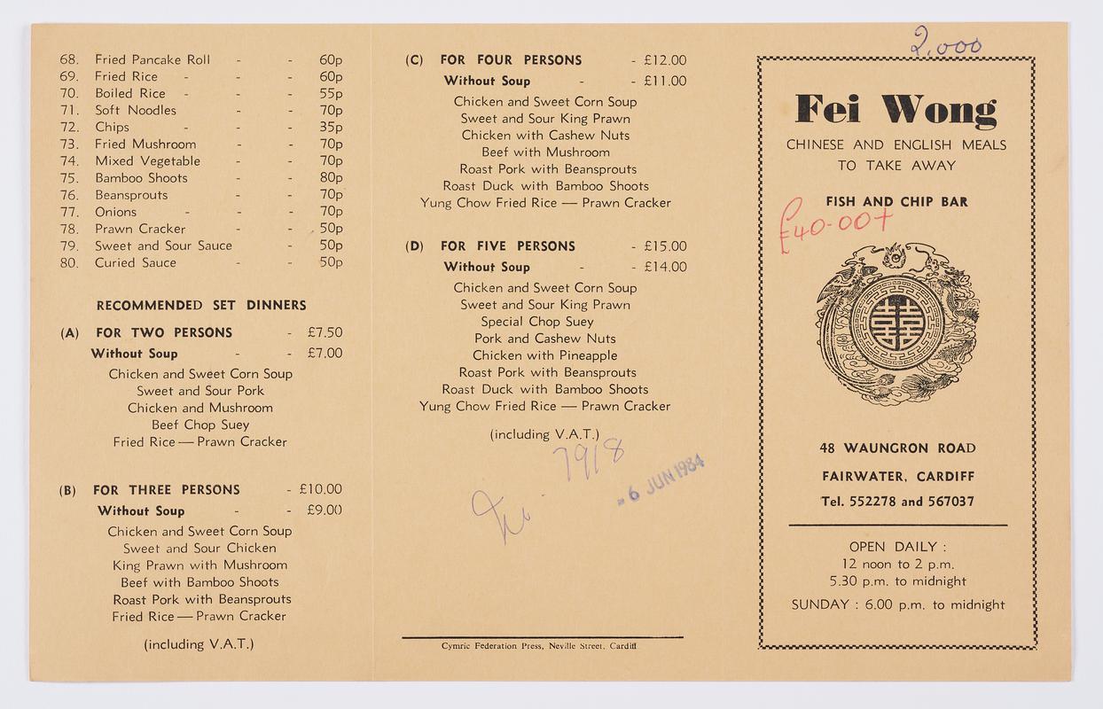 Menu printed for 'Welcome Cafe Indian Take Away', Riverside, Cardiff.