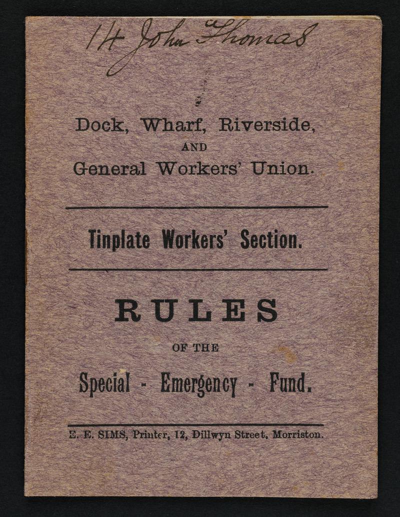 Full title - Rules of the South Wales, Monmouthshire and Gloucestershire Tin Plate Tinplate Workers' Union. 16 page booklet with green paper covers. Dated 1893.