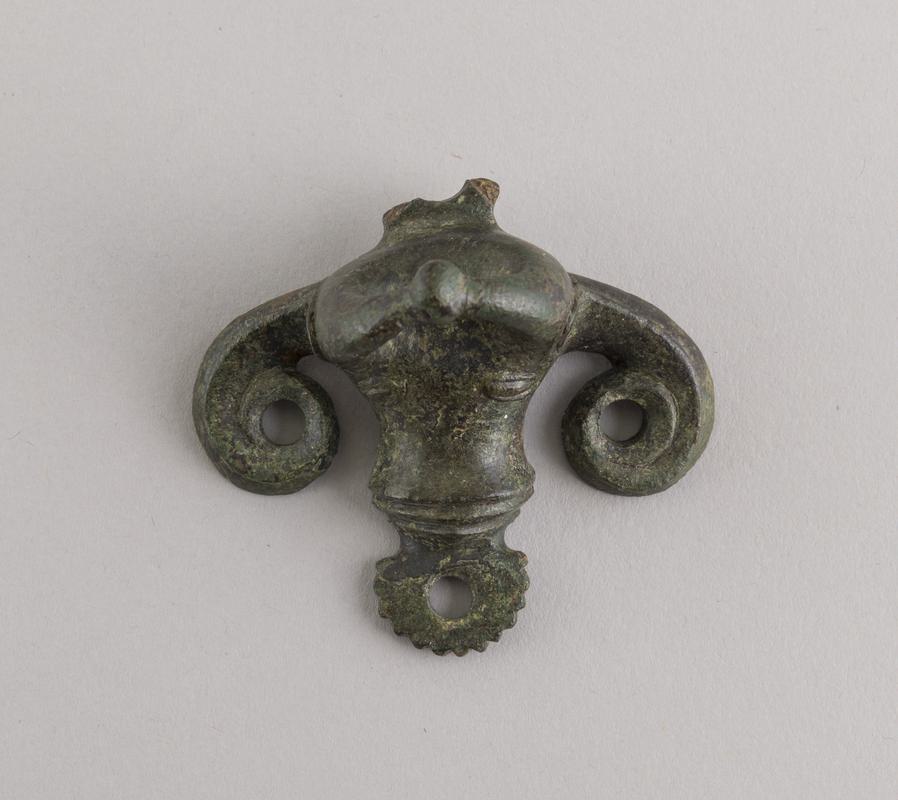 Ox-head escutcheon with flat hollowed-out back and top, projecting at right angles to rest on the top of a wooden stave-bucket and surmounted by two vertical circular ears forming a slot to receive the end of a handle and each perforated centrally for a pin securing the handle. The horns are short, forward-curving, and tipped with plain balls. The face is only slightly concave at the side and the muzzle is square and has two pits to represent the nostrils. The eyes are represented by two deep oval pits, probably for inlay or ornamental stones, now lost; two slight grooves, representing folds of the skin, are visible above one eye. The escutcheon was fastened to the top-most hoop of the bucket by two iron rivets passing through the main axis of the head, and traces of the uppermost of these remain.